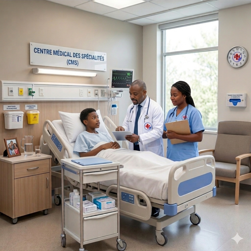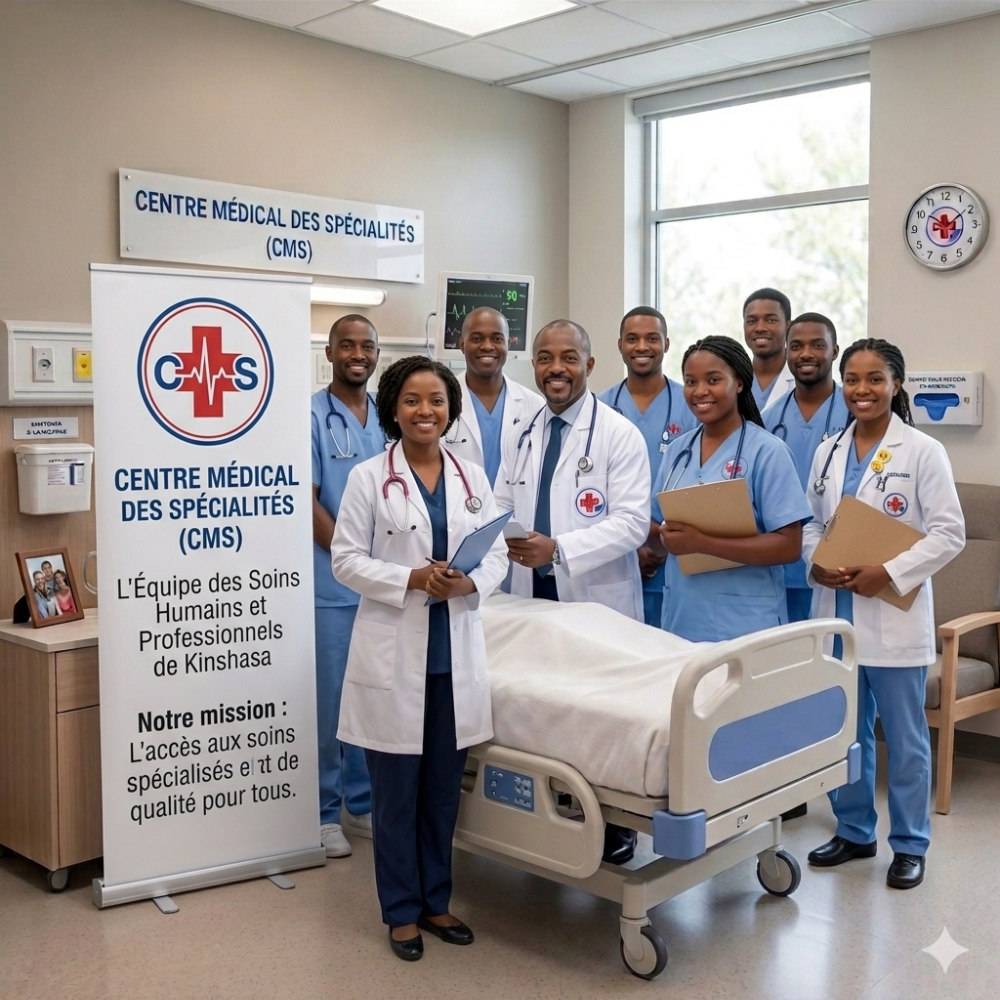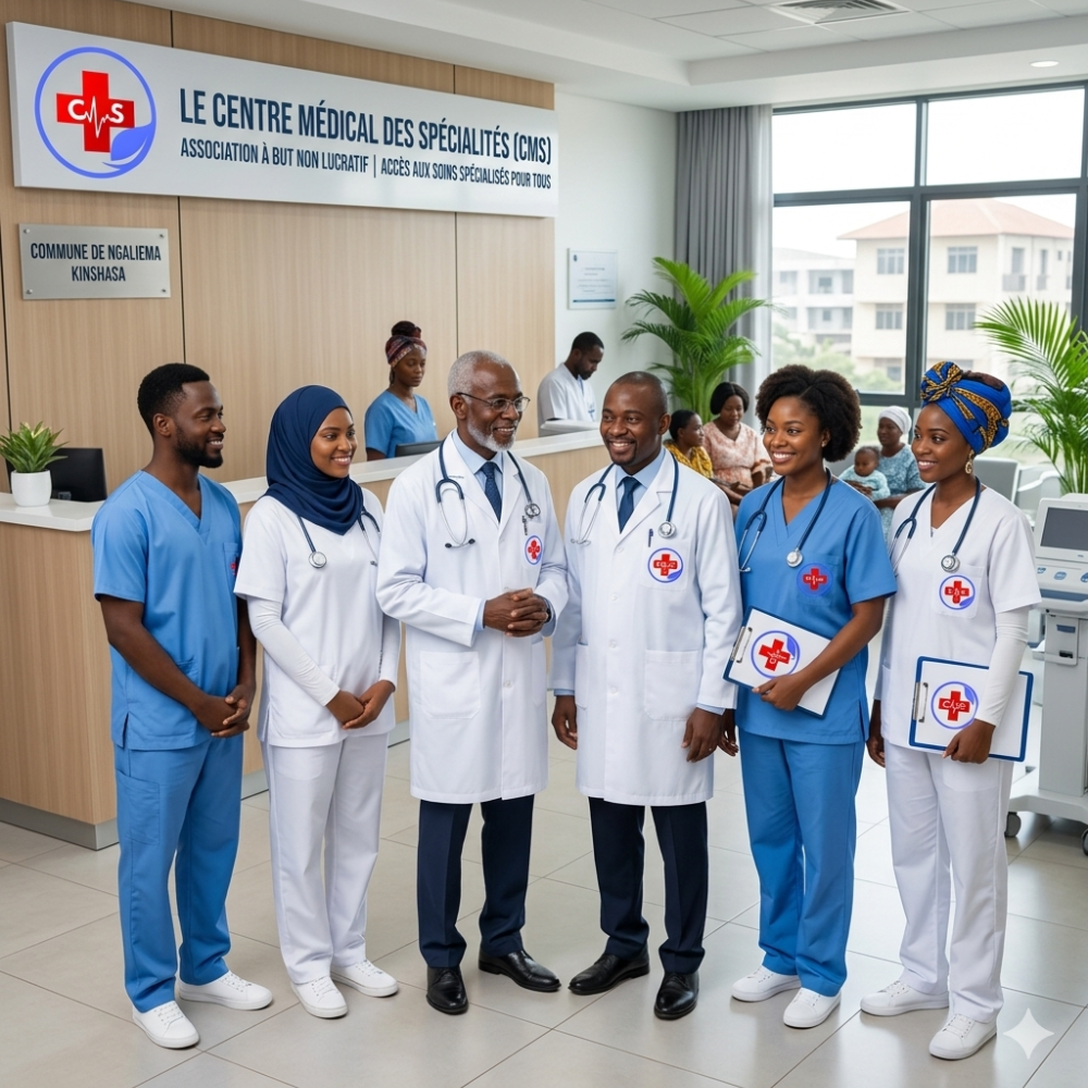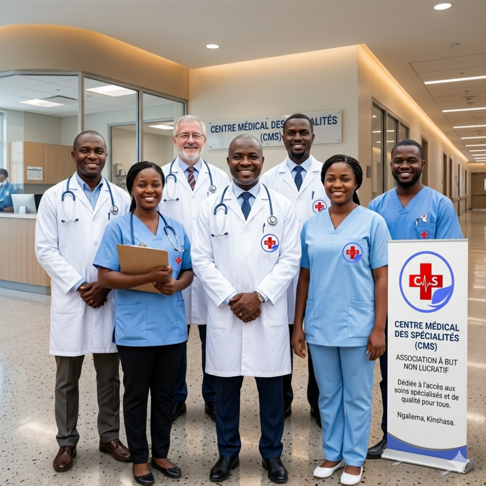Le Centre Médical des Spécialités (CMS) est une association à but non lucratif dédiée à l’accès aux soins spécialisés et de qualité pour tous. Situé à Kinshasa dans la commune de Ngaliema, notre centre rassemble des médecins spécialistes et une équipe paramédicale engagée pour offrir des soins humains, professionnels et accessibles.